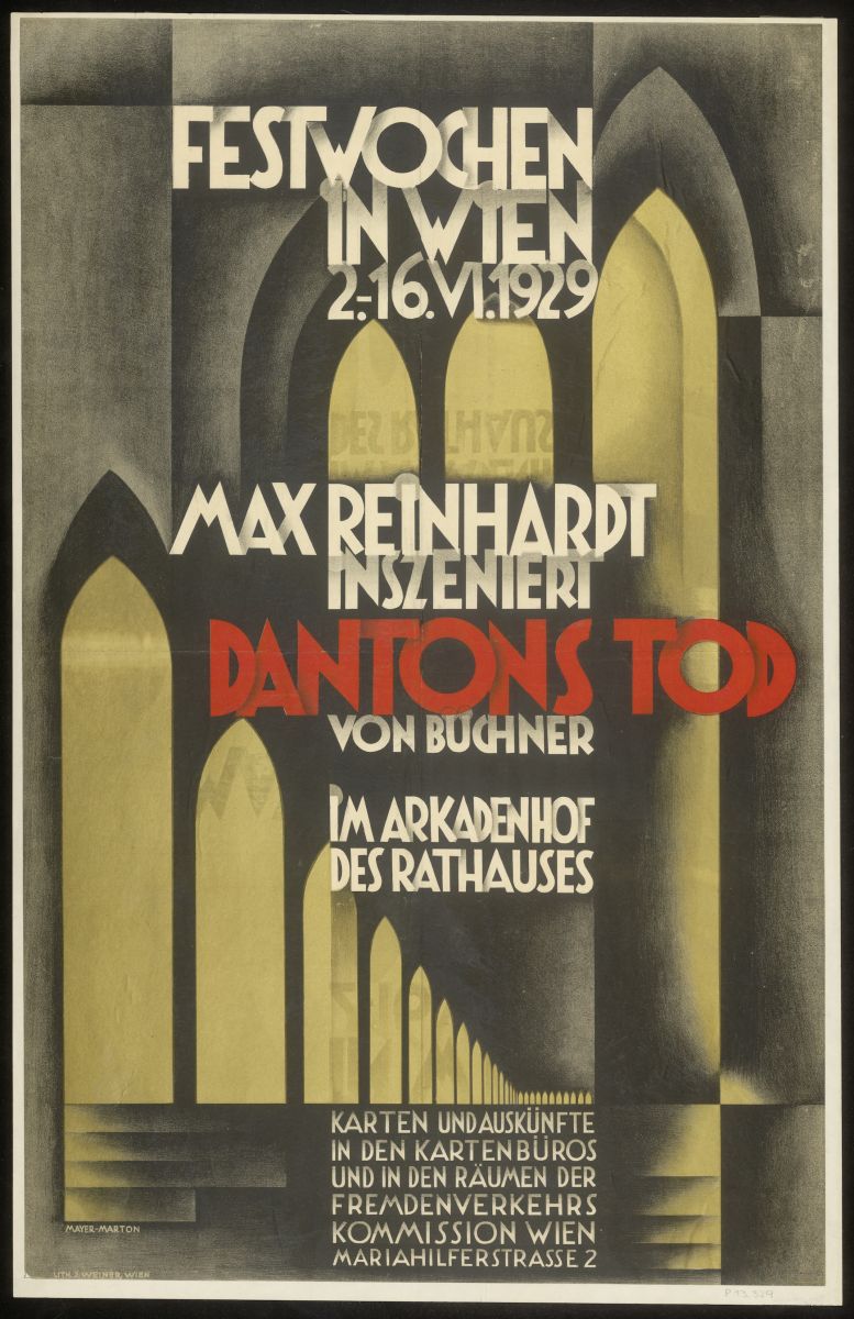 Die Wiener Festwochen mit der traditionellen Eröffnung auf dem Rathausplatz wurden in den 1920er-Jahren zum weithin sichtbaren Zeichen dieses kulturpolitischen Anspruchs. Einen Höhepunkt in seiner Verwendung des Arkadenhofs als Freilufttheater stellte die Premiere von Georg Büchners „Dantons Tod“ am 2. Juni 1929 im Rahmen der Wiener Festwochen dar, inszeniert von Max Reinhardt (1873–1943) und einem Starensemble, das unter anderen aus Mitgliedern des Burgtheaters und des Theaters in der Josefstadt bestand, darunter Paul Hartmann, Gustaf Gründgens und Hans Thimig.