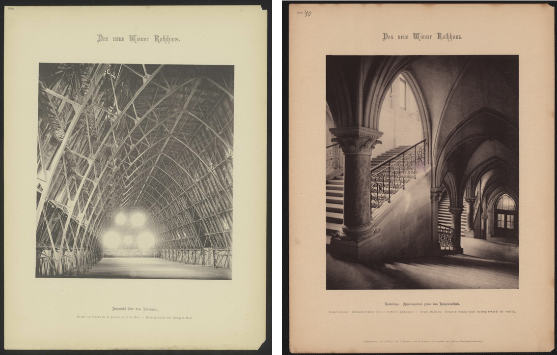 Dachstuhl über dem Festsaal des Wiener Rathauses, 1884 © Wienbibliothek im Rathaus und Feststiege des Wiener Rathauses, 1884 © Wienbibliothek im Rathaus