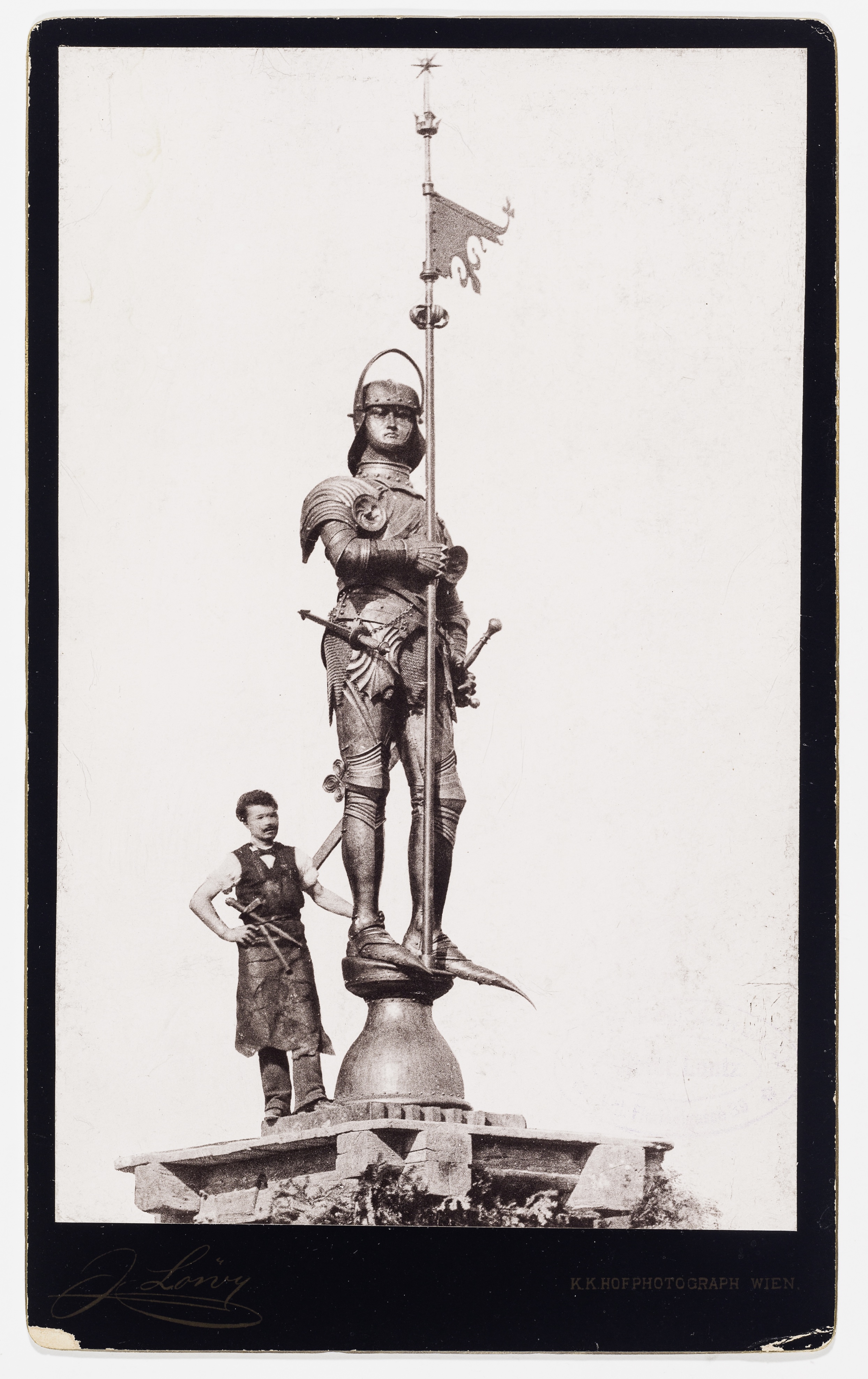 Schlosser Alexander Nehr mit seinem Wiener Rathausmann vor der Aufstellung, 1882 © Wienbibliothek im Rathaus